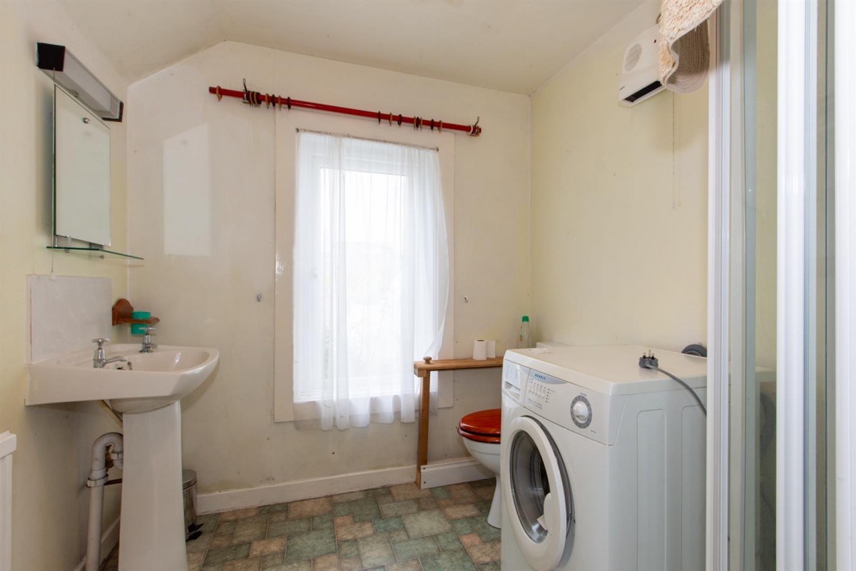 The shower room features a three piece suite comprising of a pedestal wash hand basin with twin taps, a WC, and a corner shower enclosure with electric power shower and full height wet wall panelling. A window to the side provides a source of natural light as well as ventilation. There is practical vinyl tile flooring.