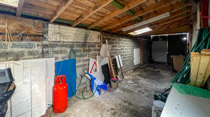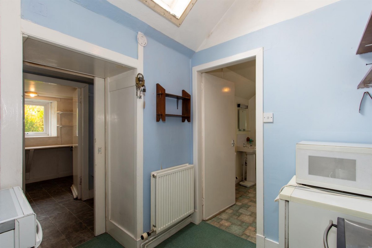 The rear hallway provides an additional storage space and features doors to the rear vestibule and shower room. A window to the side and a Velux window in the ceiling provide sources of natural light in addition to ceiling lighting. A small hatch also provides access to a loft space.