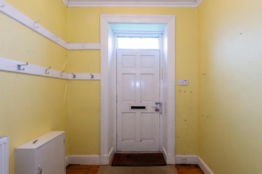 Entry is through a timber door with a glazed transom window above, leading into a timber floored entrance vestibule with ample space for outerwear and shoe storage. The space is well-lit with ceiling lighting, and a further glazed door opens into the main hall, offering a seamless transition into the rest of the home. A low level cupboard housed the electrical consumer unit and meter.